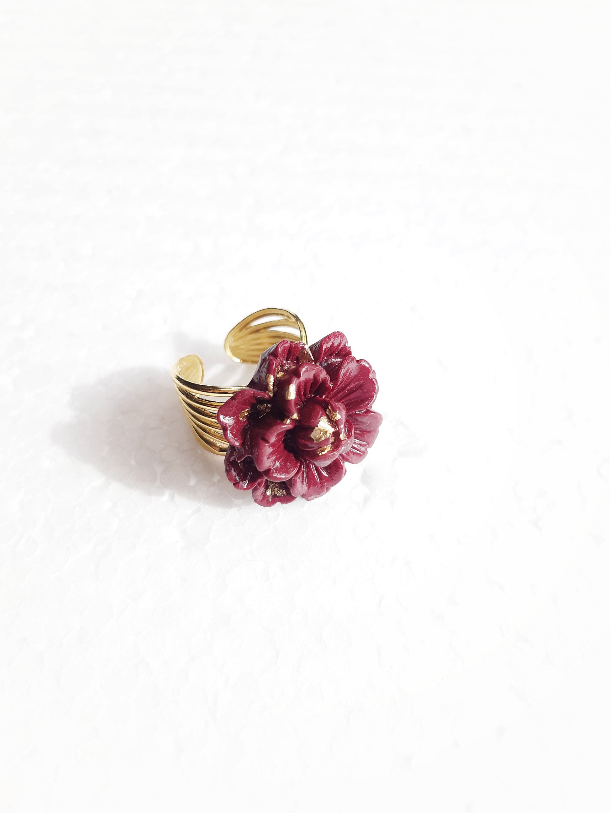 Ring composed of a gold stainless steel ring, topped with a molded and varnished polymer clay flower. On the flower are delicately placed fine pieces of gold leaf.