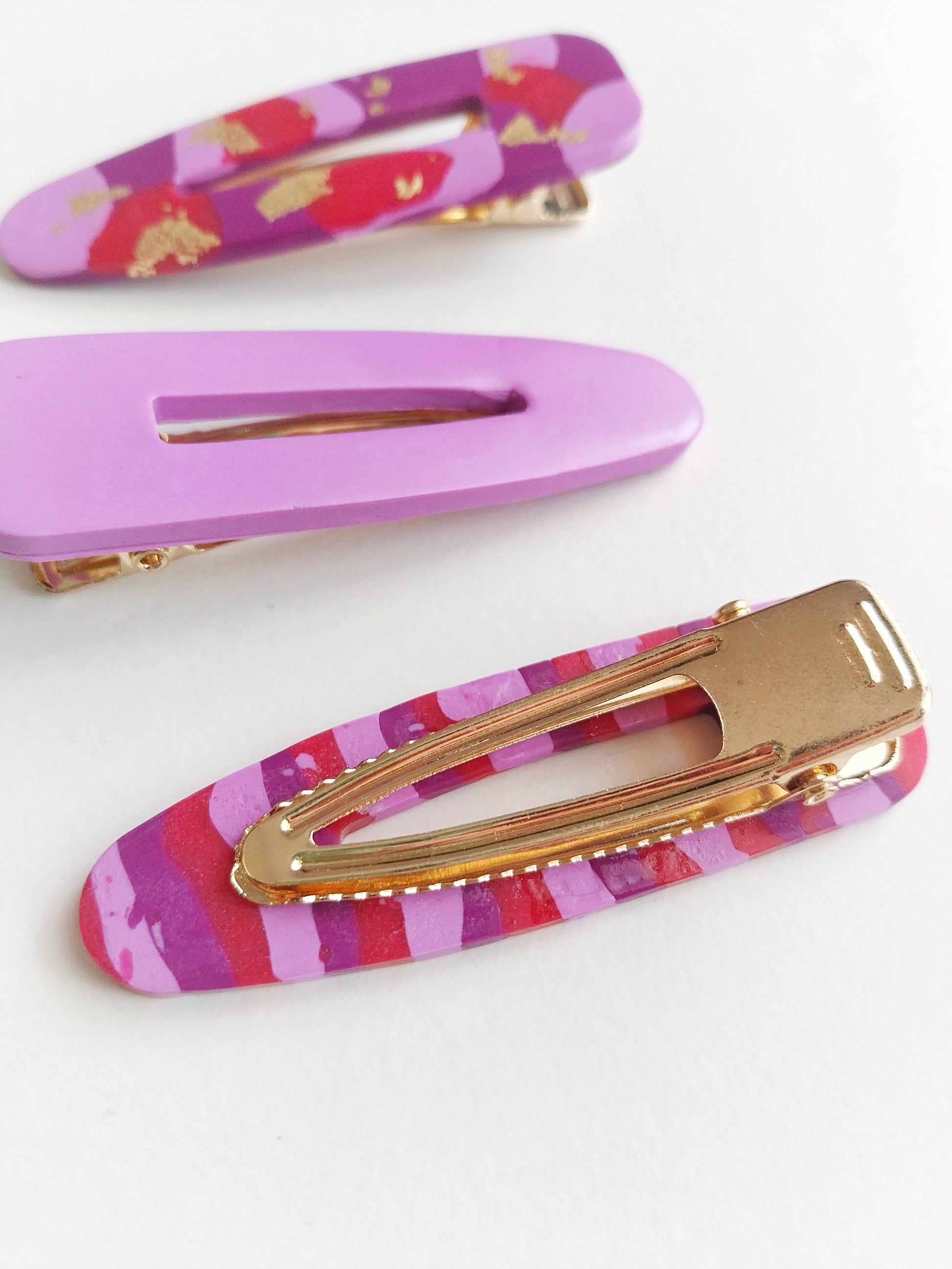 Cette jolie barrette à pince, à glisser dans vos cheveux, se compose d’un apprêt en laiton doré, et d'un corps en argile polymère coloré et léger.