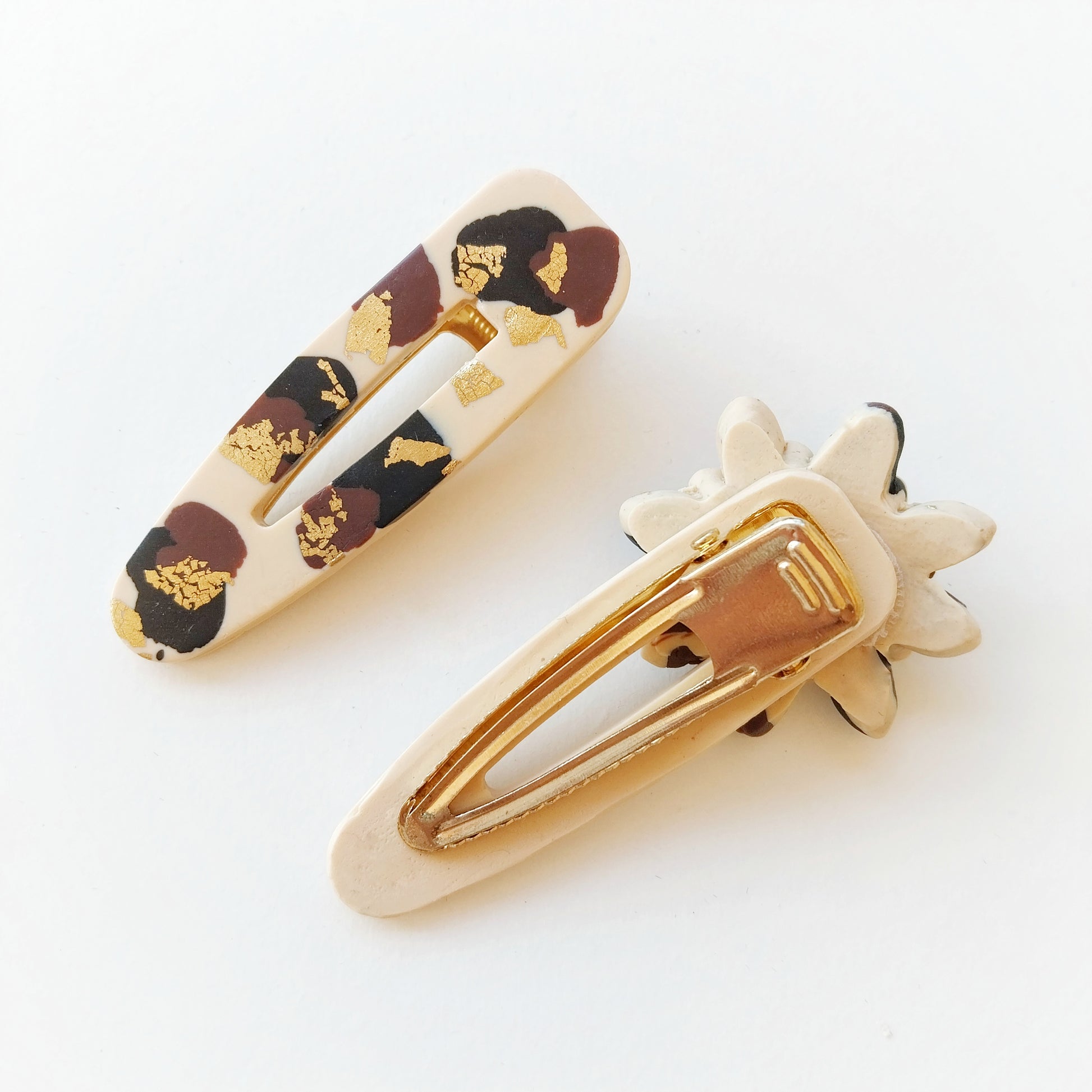 Cette jolie barrette à pince, à glisser dans vos cheveux, se compose d’un apprêt en laiton doré, et d'un corps en argile polymère coloré et léger.