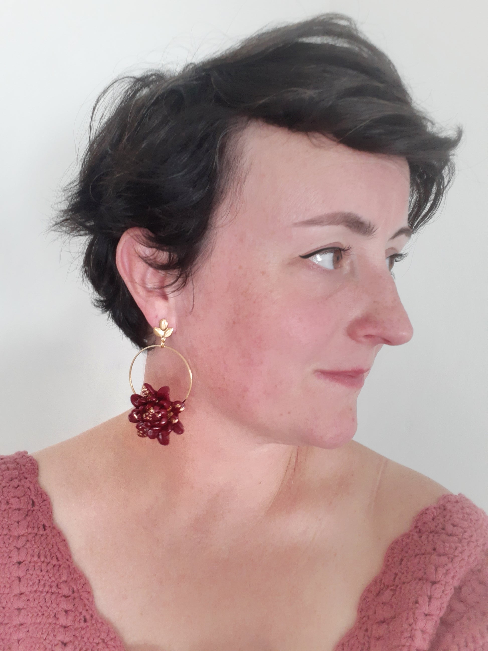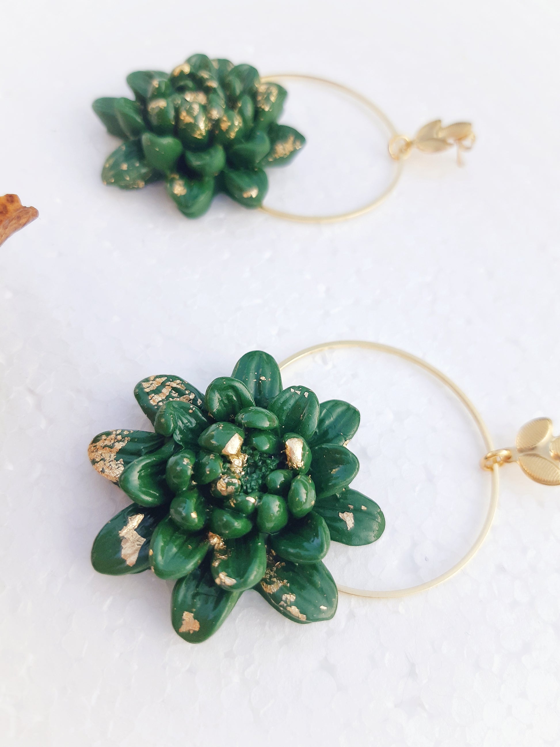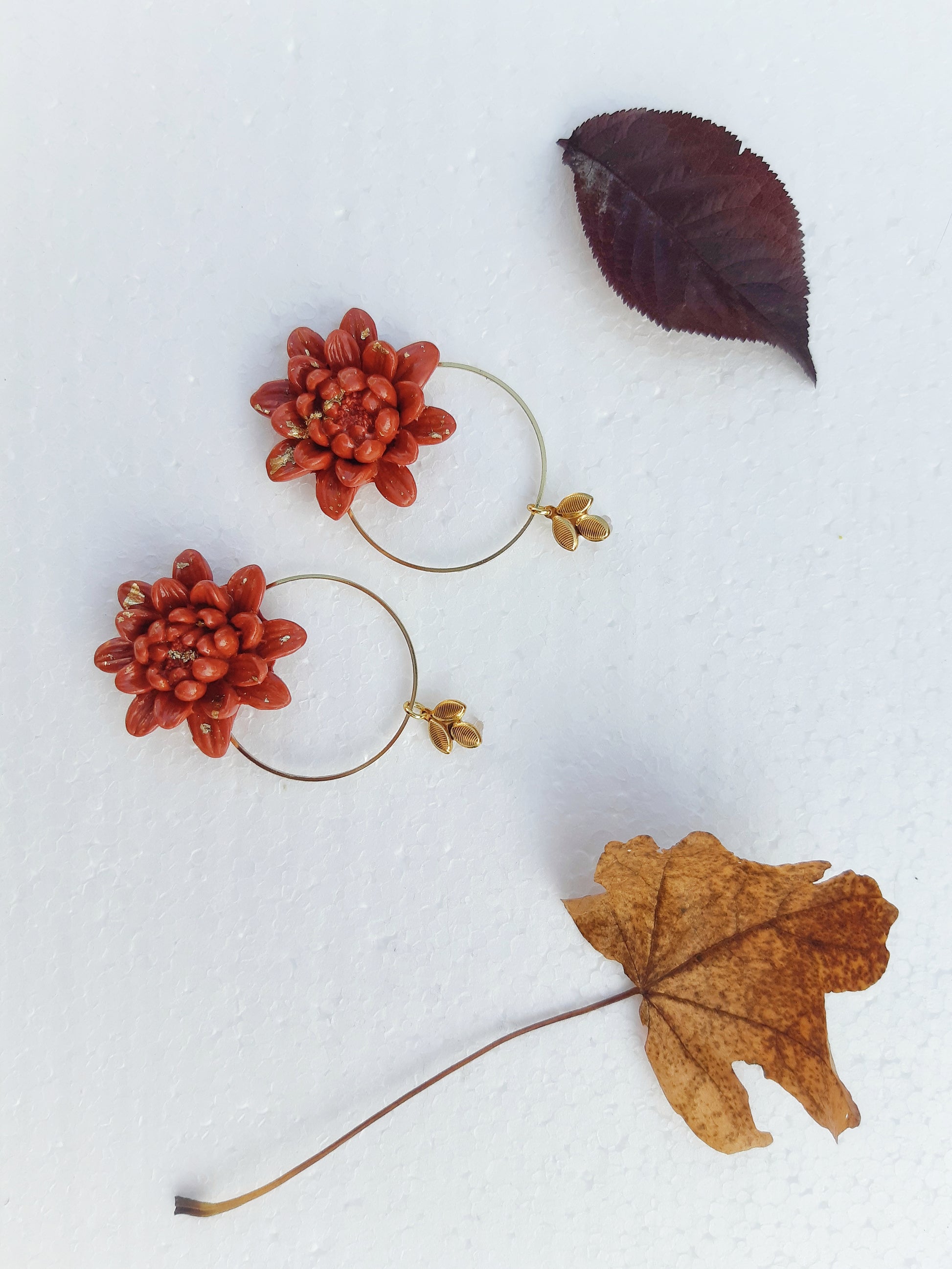Earrings made up of a brass ring gilded with fine 18-carat gold, a large flower in molded and varnished polymer clay. On the flower are delicately placed fine pieces of gold leaf. They attach with a stainless steel nail gilded with 18K fine gold in the shape of foliage.