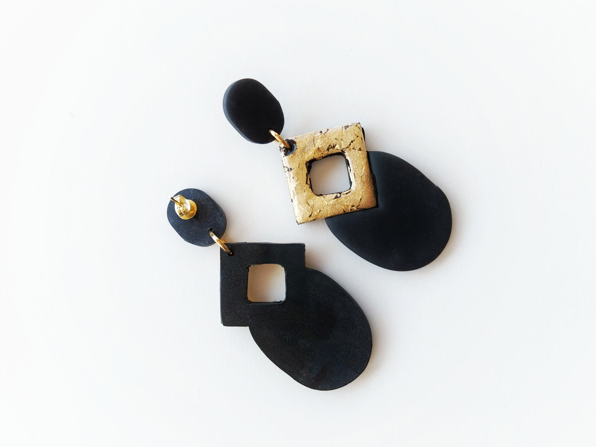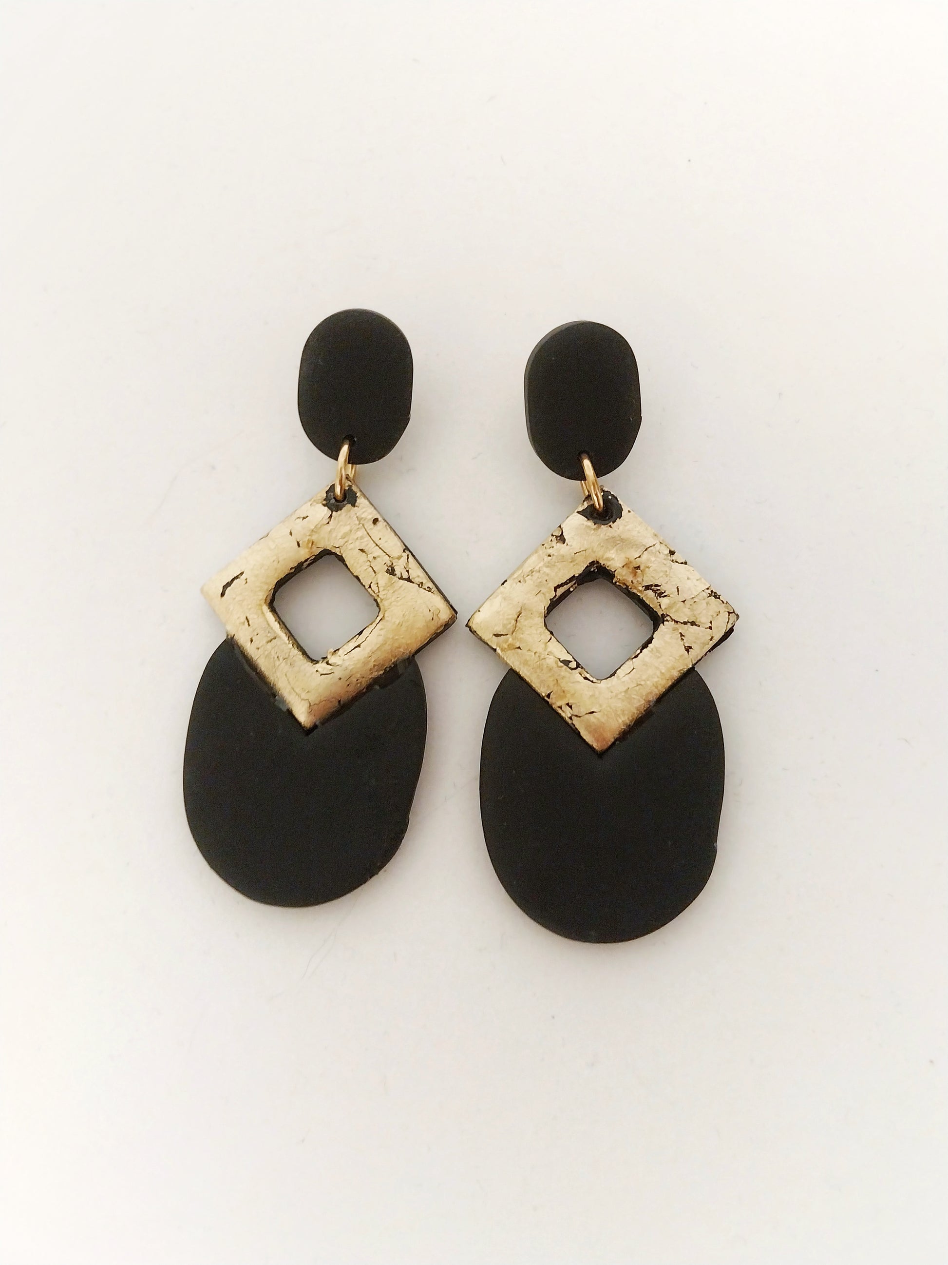 Boucles d’oreilles composées de pampilles en argile polymère moulée et vernie. Sur les boucles sont délicatement déposés de fins morceaux de feuille d'or fixés par de la résine. Elles s'attachent par un clou en acier inoxydable doré.