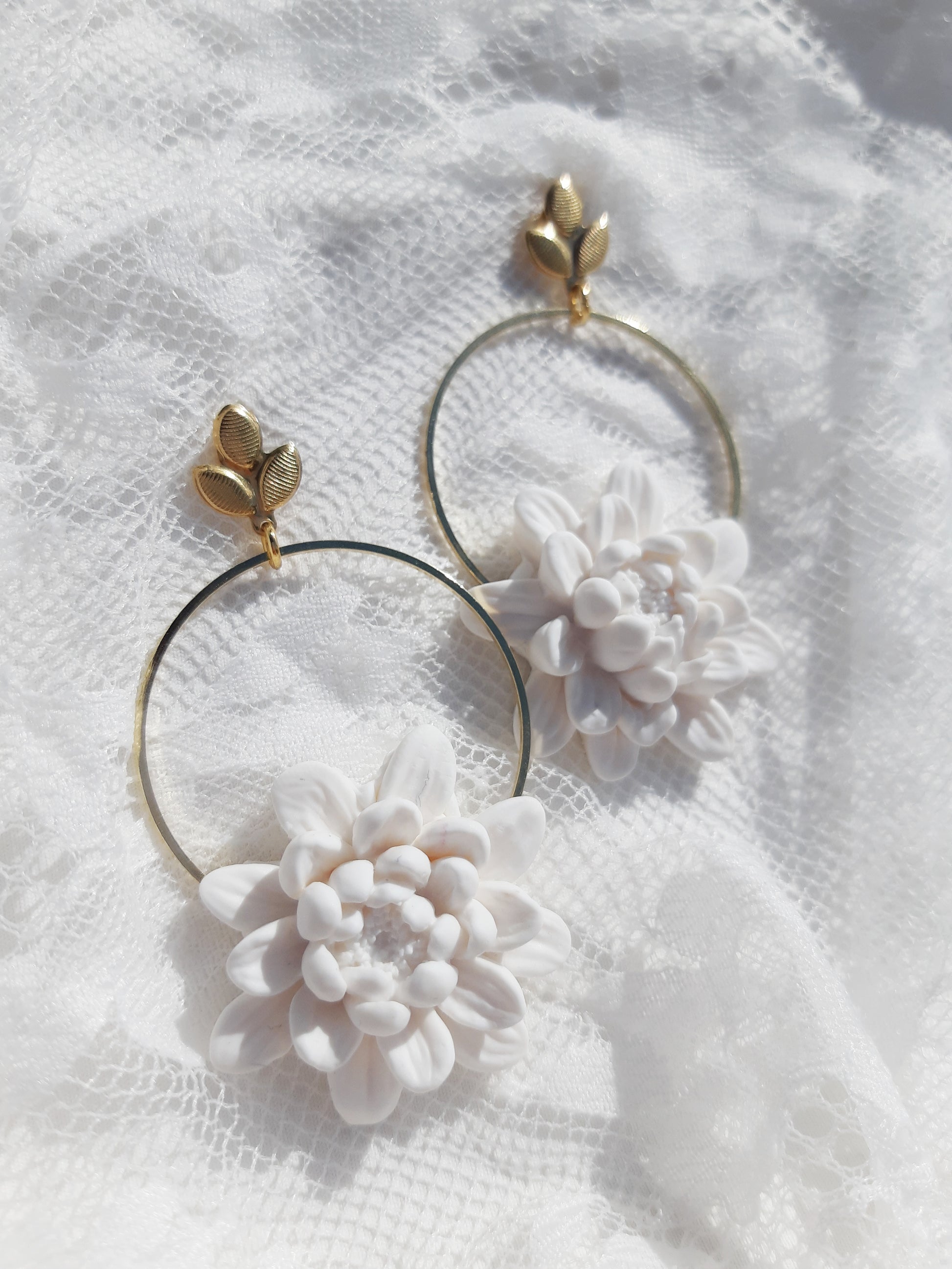 Earrings made up of a brass ring gilded with fine 18-carat gold, a large flower in molded and varnished polymer clay. They attach with a stainless steel nail gilded with 18K fine gold in the shape of foliage.