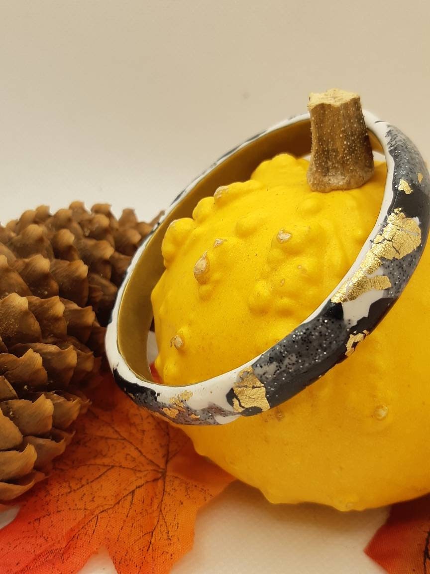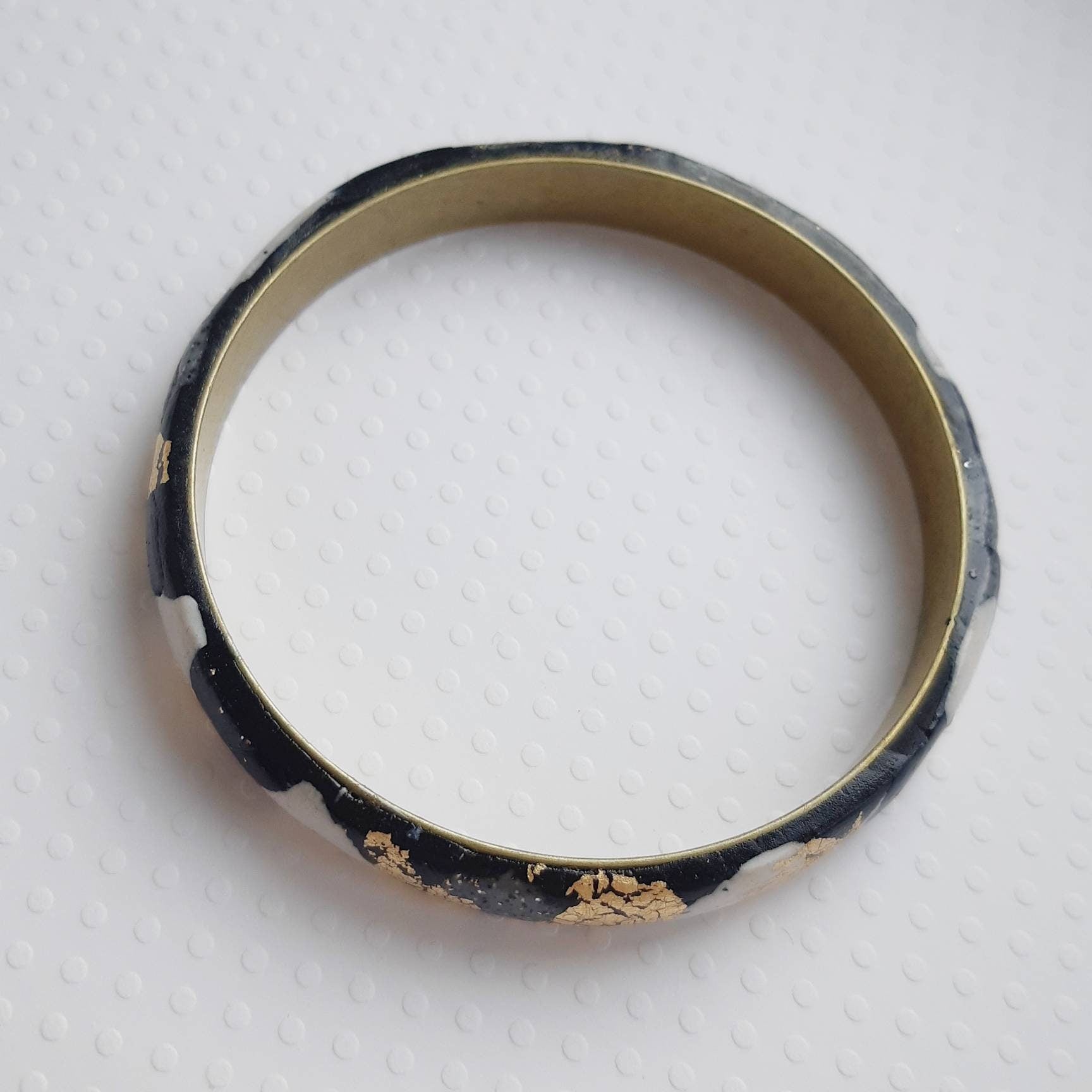 This pretty bracelet is made up of a golden brass bangle decorated with polymer clay (cold porcelain) black, white, gray, glittery fir green (very discreet) and gold leaf. The bracelet is varnished to resist life. The brass brings a "weight" to the bracelet which is very pleasant to wear. A strong piece that will liven up your demure looks!