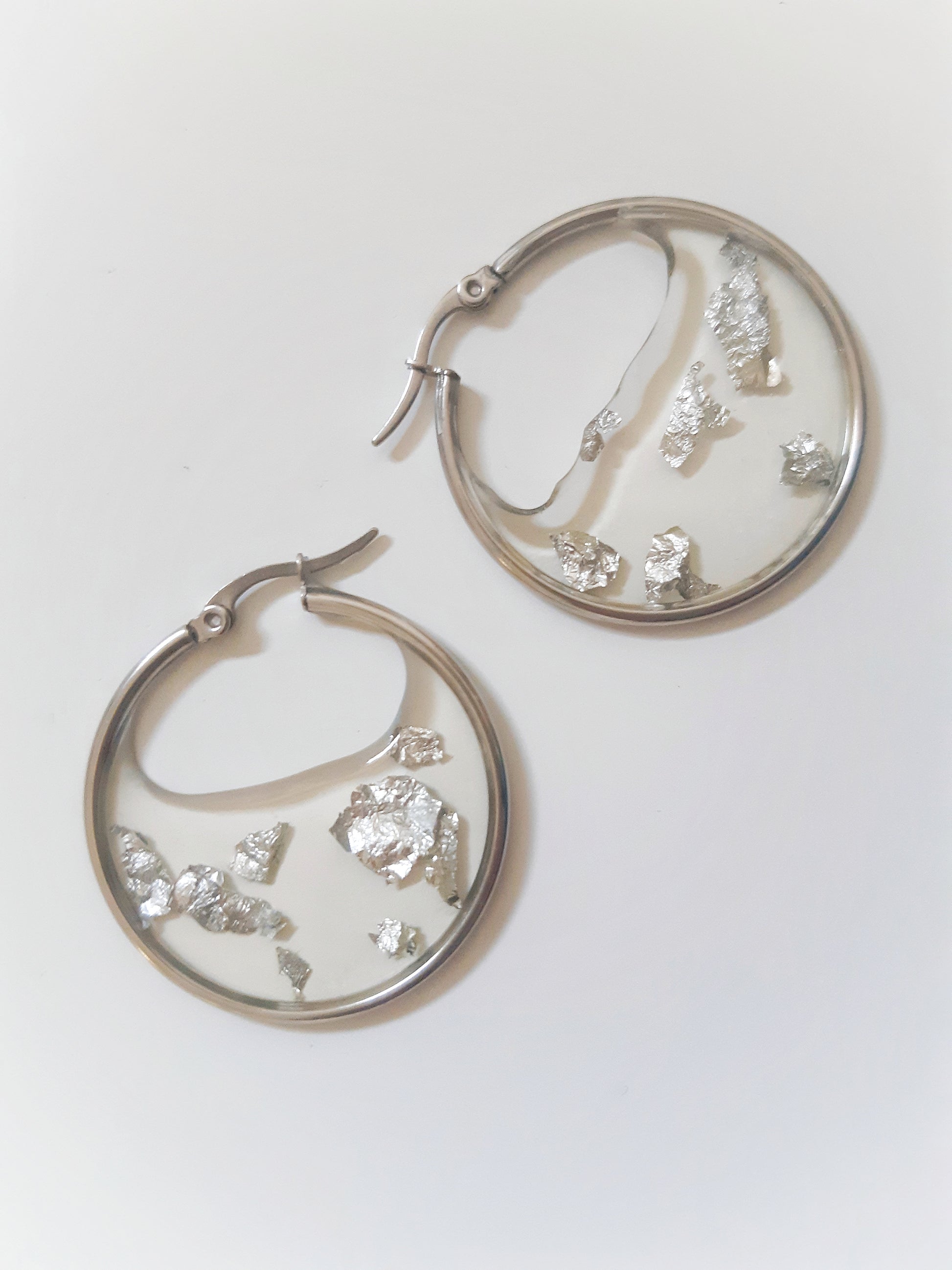 These pretty hoop earrings are called Bangka (like an island in Indonesia, my country of heart) and are made up of a gold stainless steel hoop in which transparent resin, gold leaf and dried flowers are encrusted. .