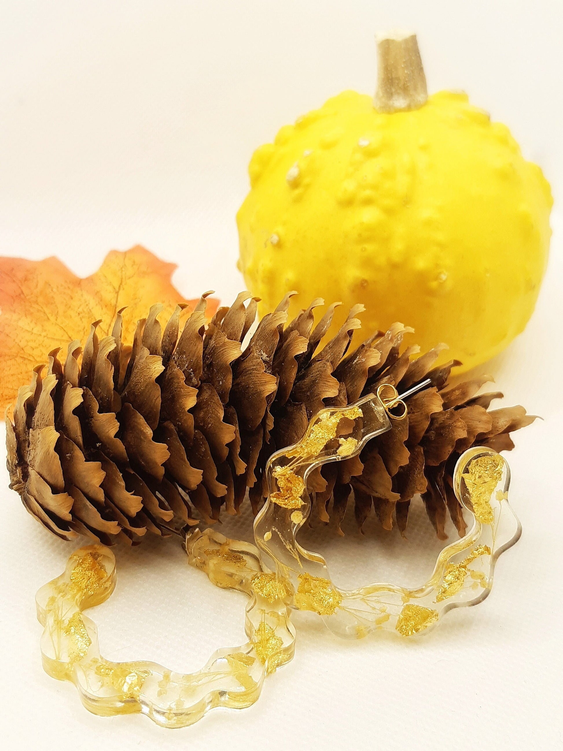 • Dimensions: Total length: 5 cm - Max width: 4.5 cm • Hypoallergenic gold stainless steel studs • Body of the jewel in resin