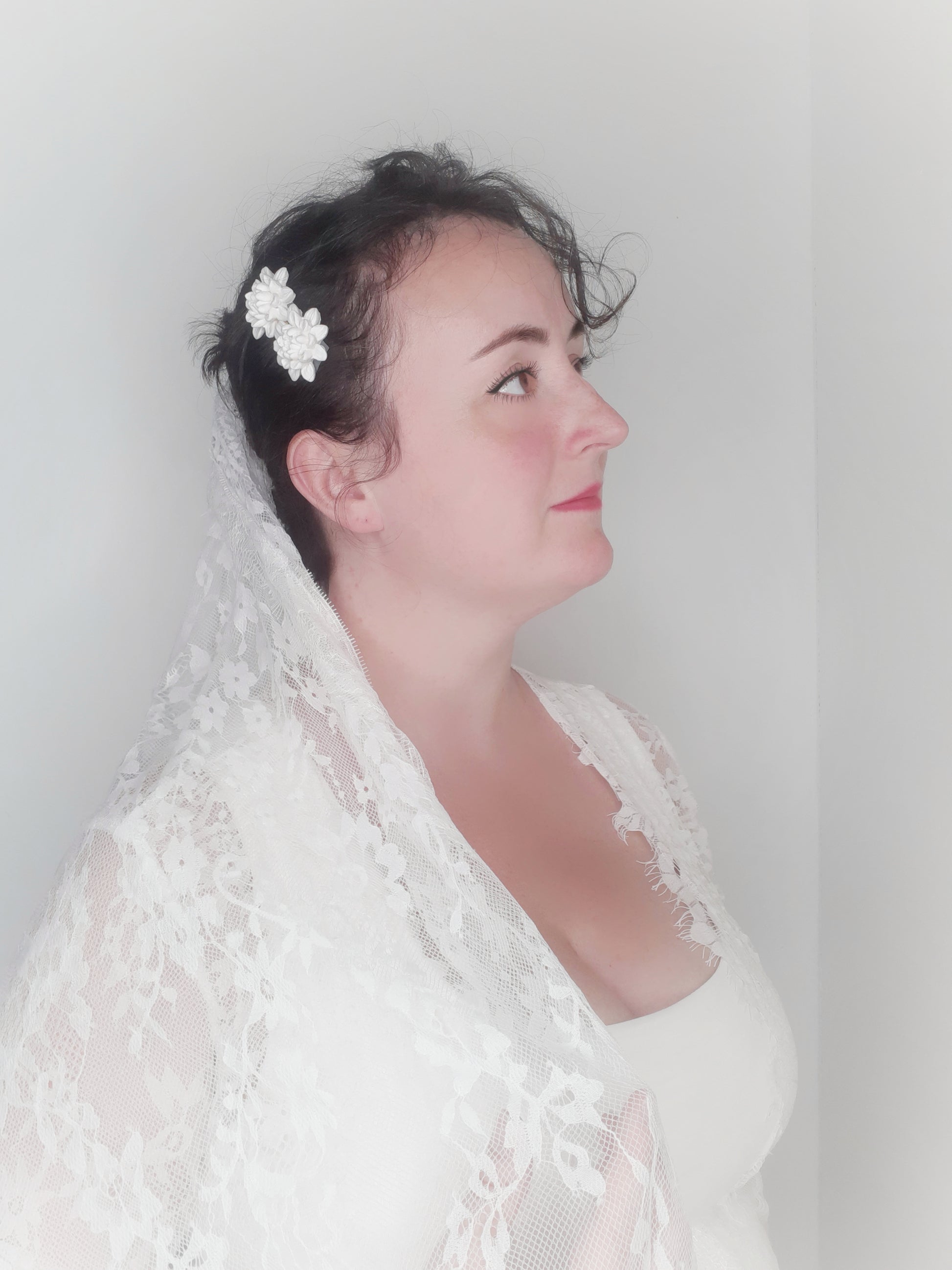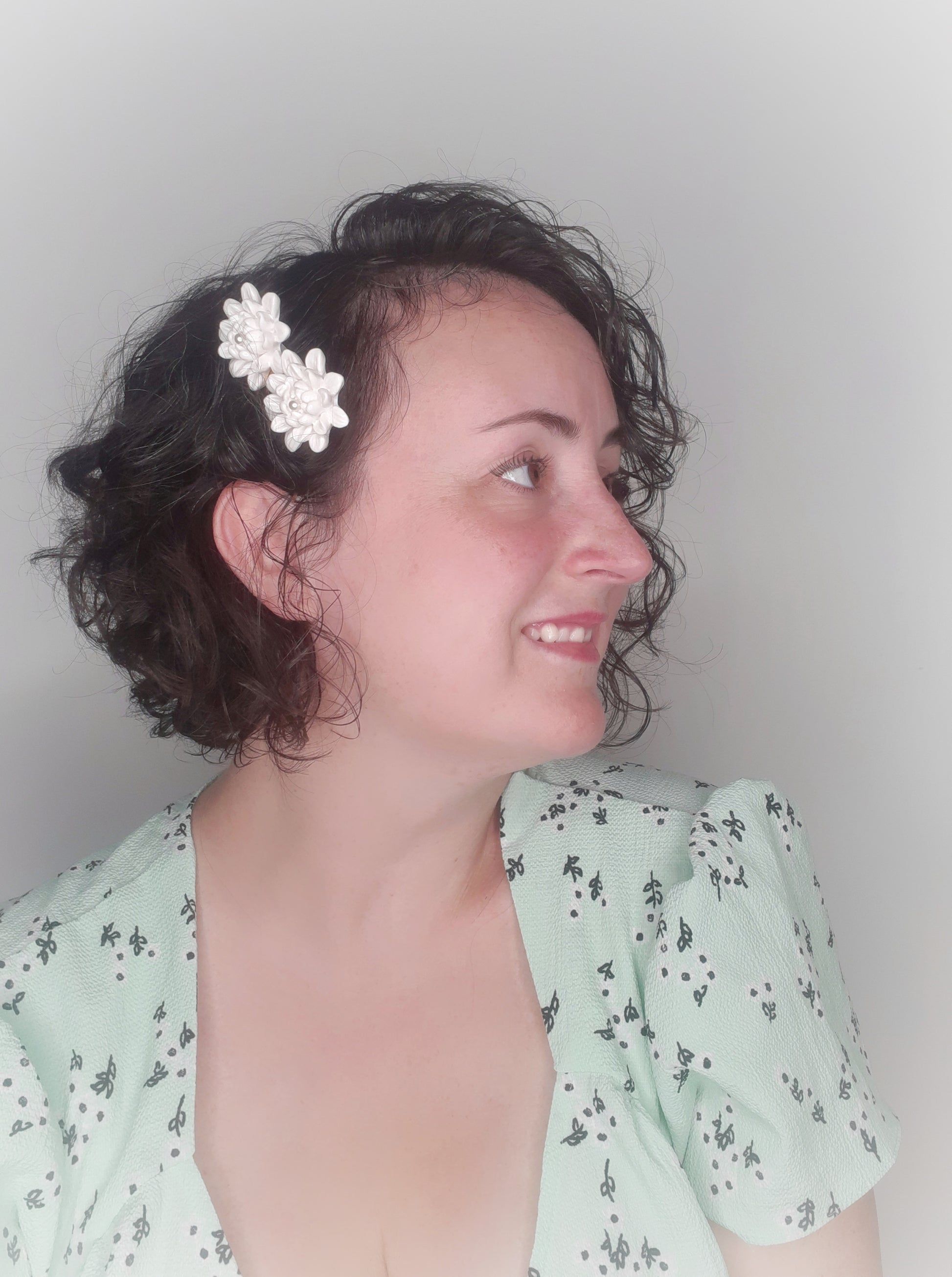 This little comb, to slip through your hair, consists of a golden brass body, and 2 white polymer clay flowers. At the heart of each of the 2 flowers, a small discreet pearl.