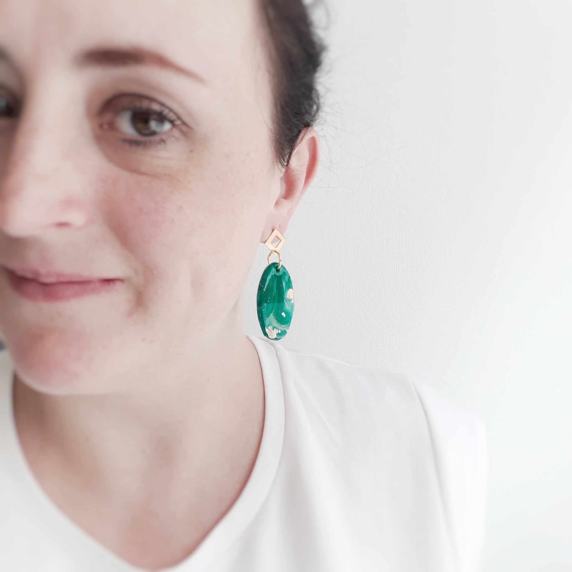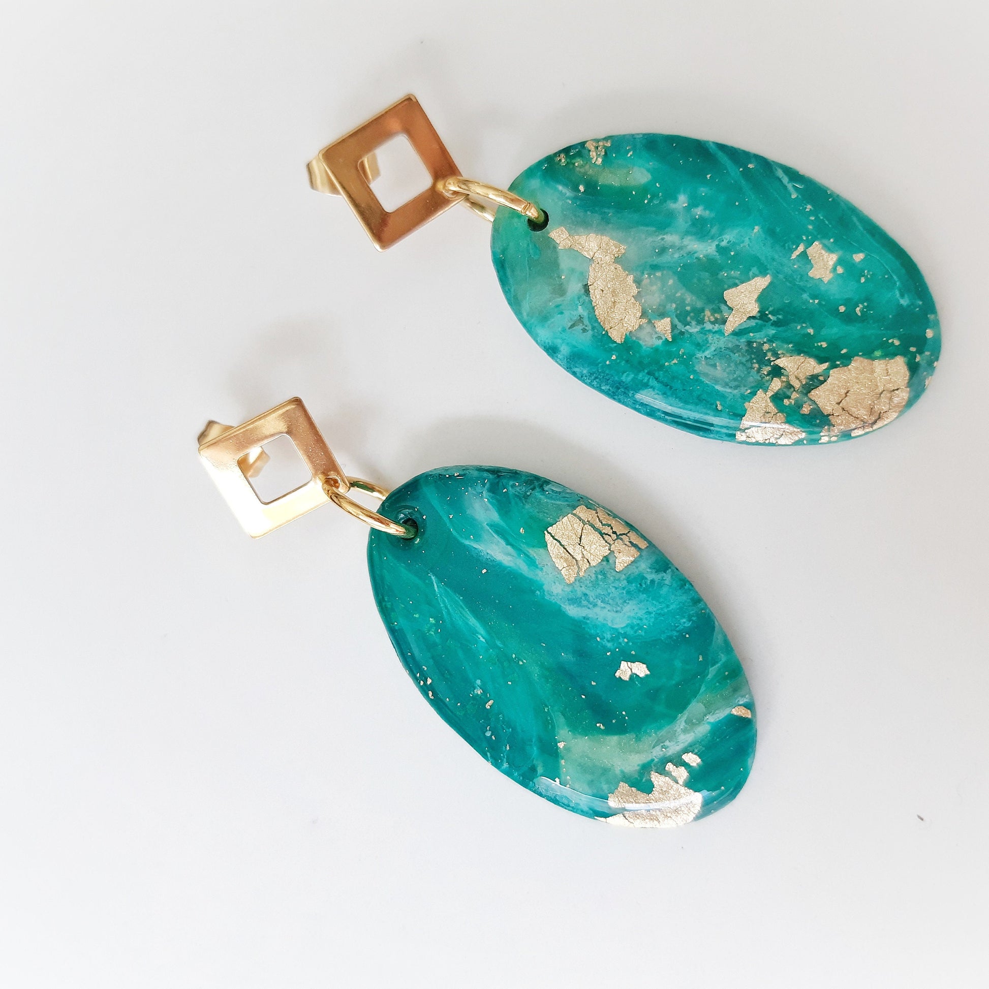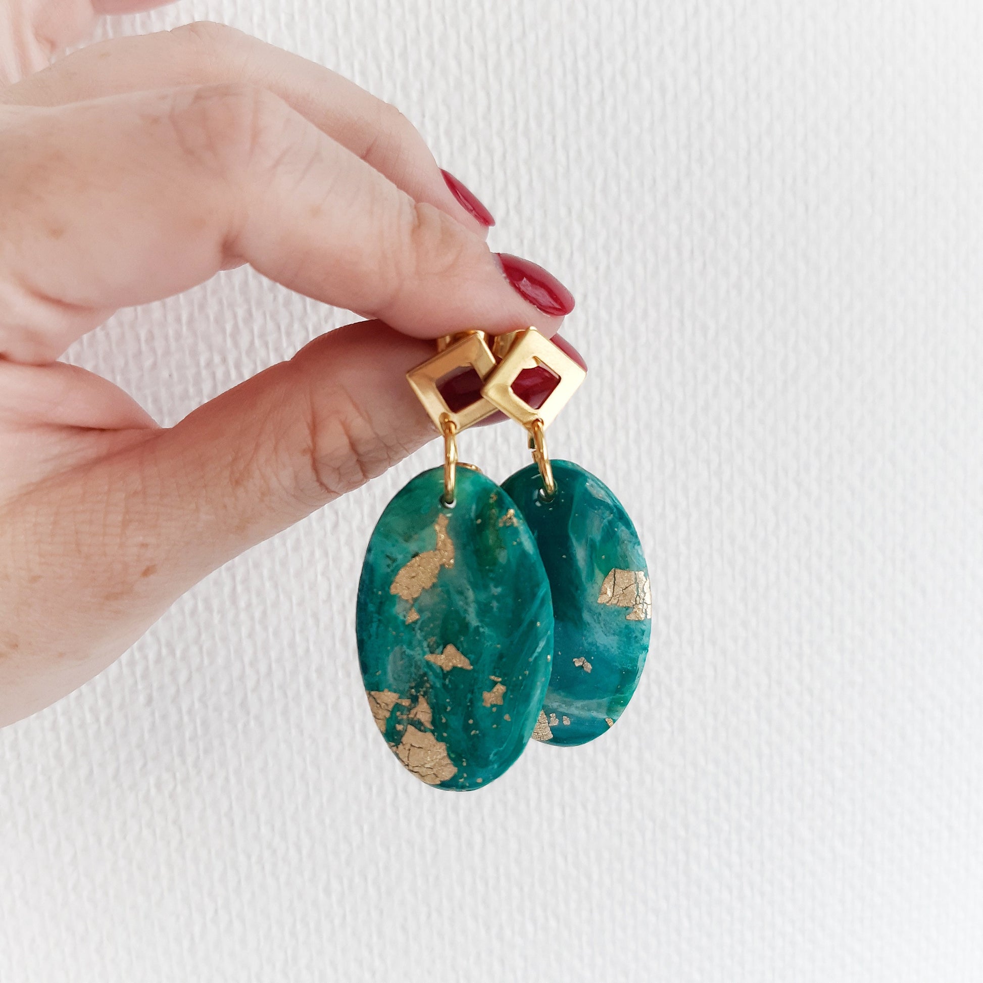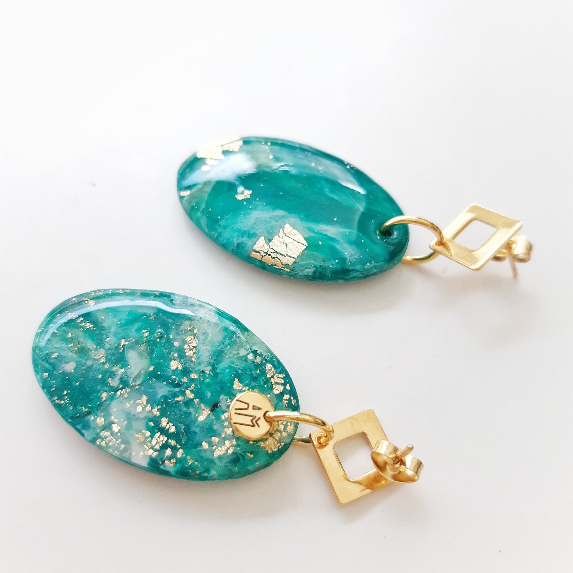 Thick dangling earrings in polymer clay imitation jade stone (different tones of green) and gold leaf, protected by resin. They attach with a fancy square hollow-shaped nail in gold stainless steel. To better understand the size of the jewelry, refer to the photo of the jewelry worn.