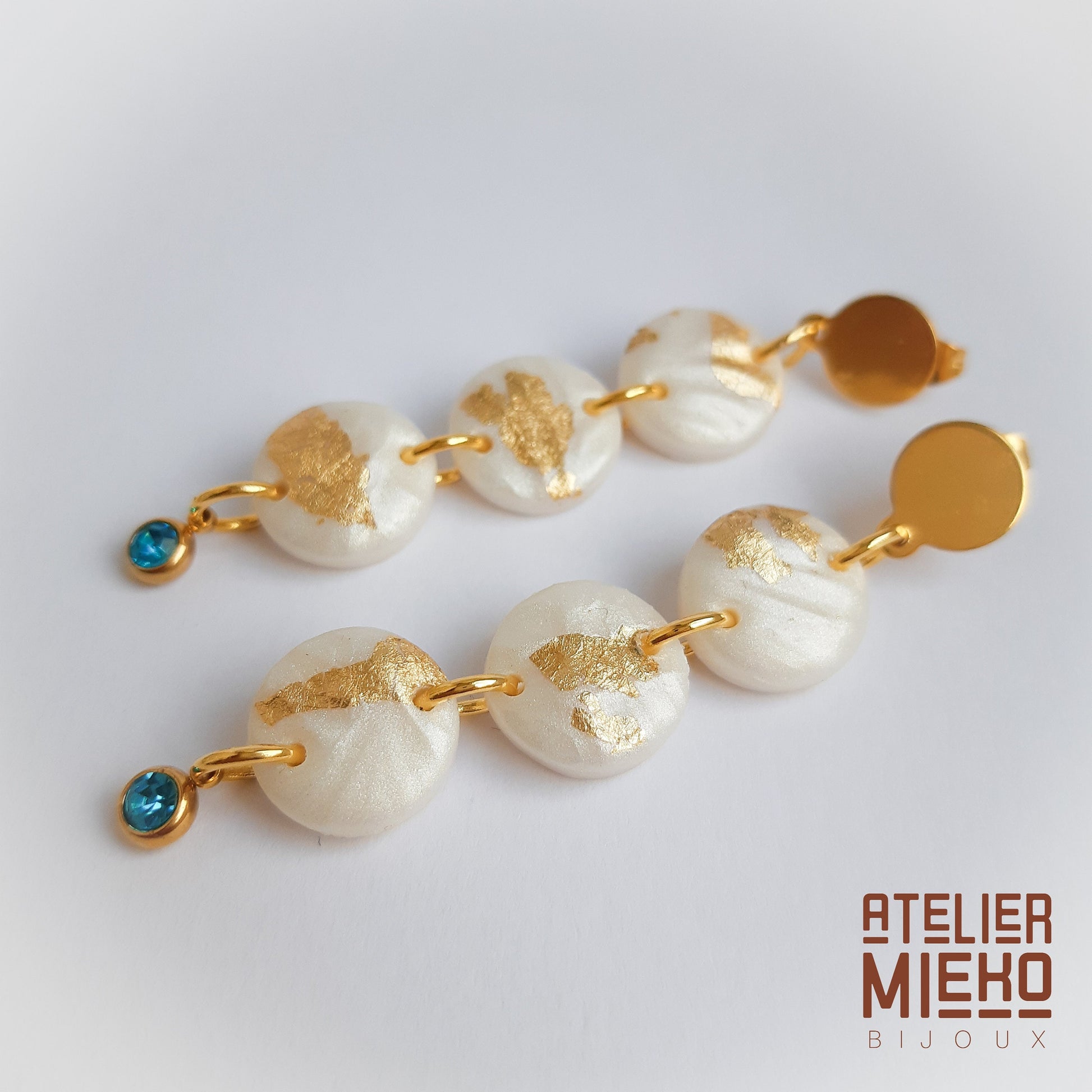 Ces jolies boucles d’oreilles se composent de 3 pampilles rondes en argile polymère blanc texturée puis vernie et parée de touches de feuilles d’or. Elles s’attachent par des clous en acier inoxydable doré rond. Elles sont terminées en bas par une perle de verre turquoise avec cerclage en acier inoxydable.