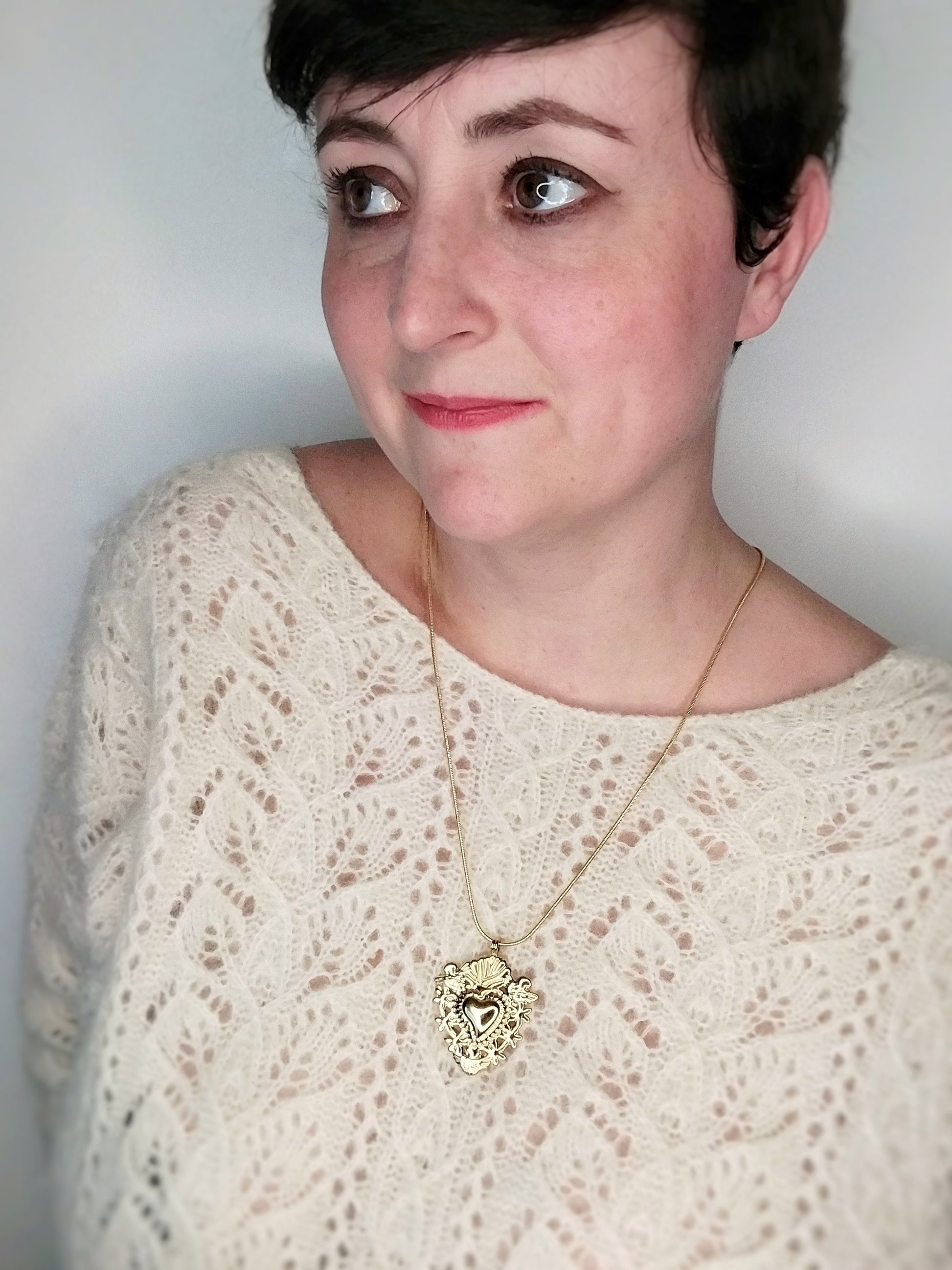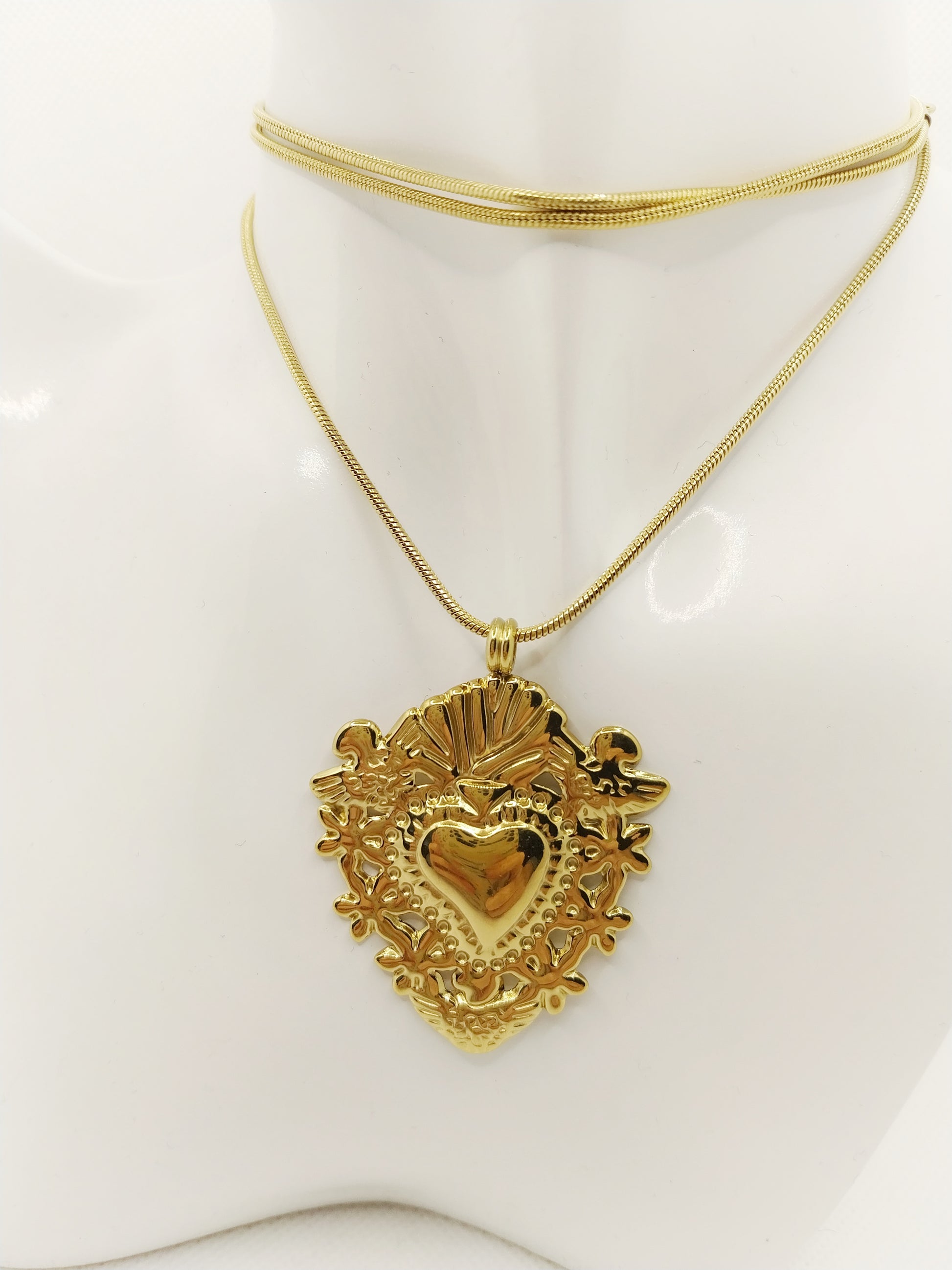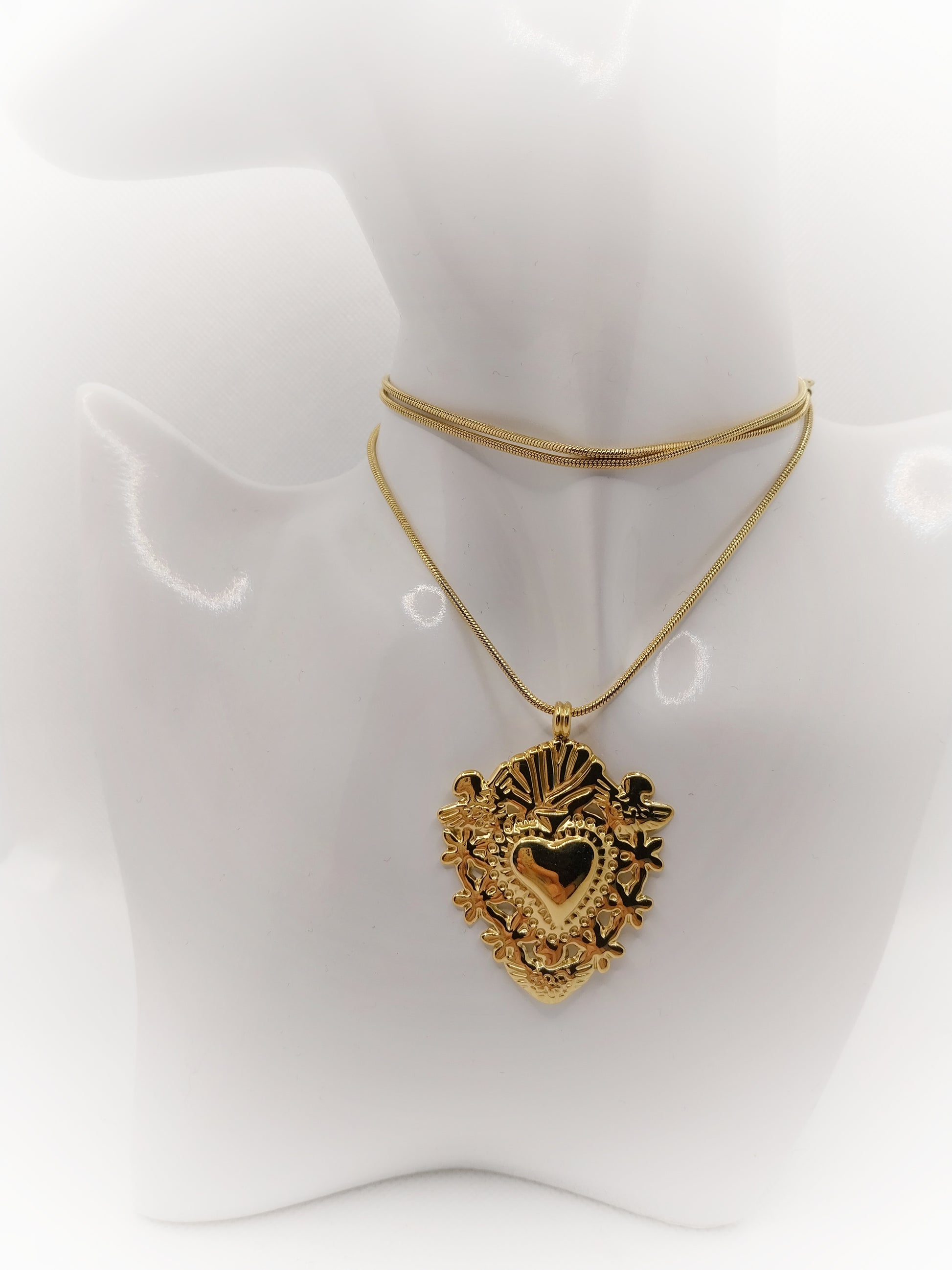 Un long sautoir doré, orné d’un pendentif ex-voto travaillé comme une relique moderne.